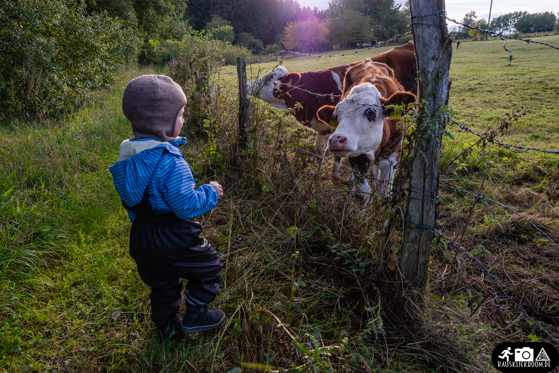 Gesagt, getan sind wir dann aus dem nahegelegenen Örtchen Diefenbach los, um die geplanten ca. 3,3 Kilometer zur Plattform zu laufen. Durch die zahlreichen Kühe und Schafe war die kleine Wanderung für uns 3 wirklich sehr schön. Bis auf ein paar kleine Anstiege ist der Kleine auch fleißig mitgelaufen.