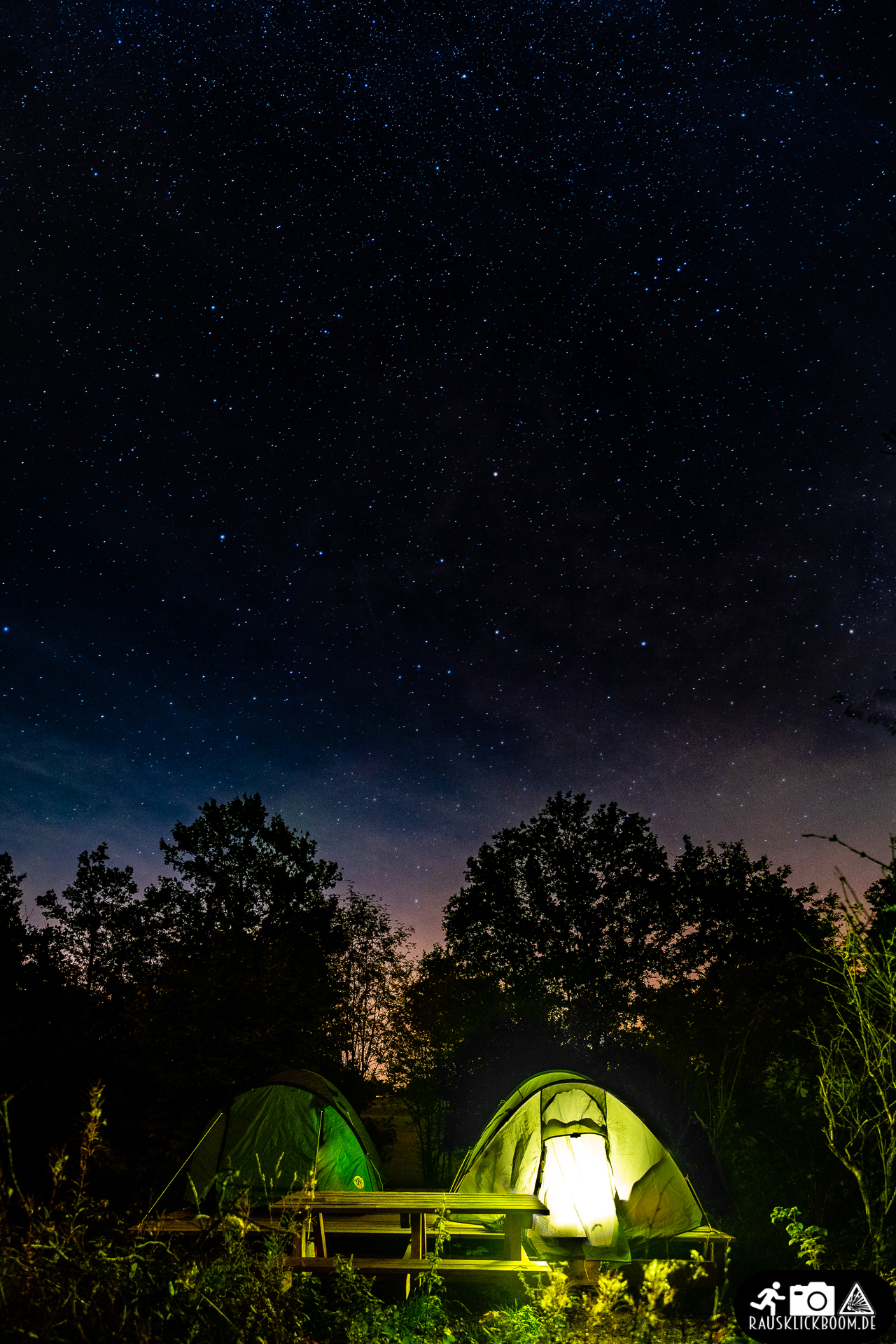 An der Plattform haben wir dann unser Tunnel-Trekkingzelt* gerade so eben auf die Plattform bekommen. An dem zugehörigen Picknicktisch konnten wir dann gemütlich zu Abend essen, um dann schon um 20 Uhr im Bett zu liegen. Ich würde das ganze viel weniger gern machen, wenn ich nicht nochmal aus dem Zelt rascheln würde, um zu gucken, ob es nicht einen schicken Sternenhimmel gibt. Den gab es nur bedingt, aber der Regler „Dunst entfernen“ im Lightroom wirkt manchmal Wunder. Zugegebenermaßen hatte ich keine wirklich entspannte Nacht, weil ich doch immer nach dem Kleinen geschaut hab. Denn wenn man das Ganze nüchtern betrachtet, ist Unterkühlung natürlich ein Thema, aber nicht selten eher Überhitzung, wenn man eben den gesunden Punkt beim Layern verpasst. Es war zum Glück alles passend und der Nacken war warm, aber bestenfalls ganz leicht verschwitzt. Wir haben ja schon sehr früh Erfahrung mit dem Zelten mit ihm gesammelt. Hier gibt es einen Eindruck von unserer Elternzeitreise. Mehr Schichten wären auf jeden Fall nicht ratsam gewesen…